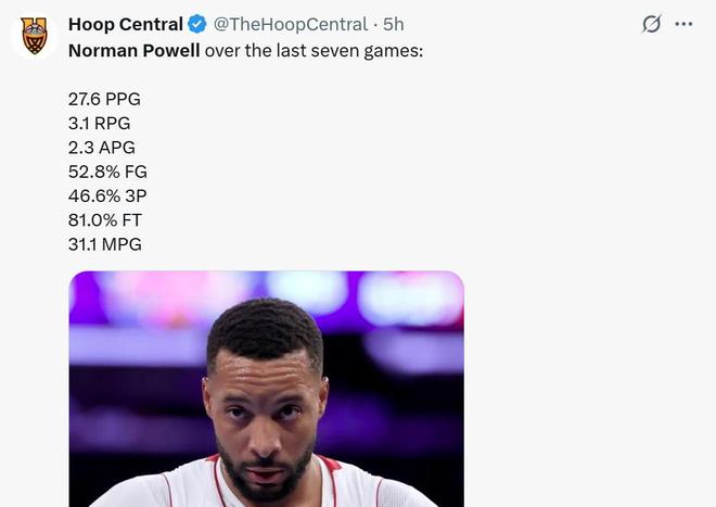 并且鲍威尔的表现还有明显的上升势头,过去7场比赛场均数据提升至27.6分3.1篮板2.3助攻,整体命中率52.8%,三分命中率46.6%。